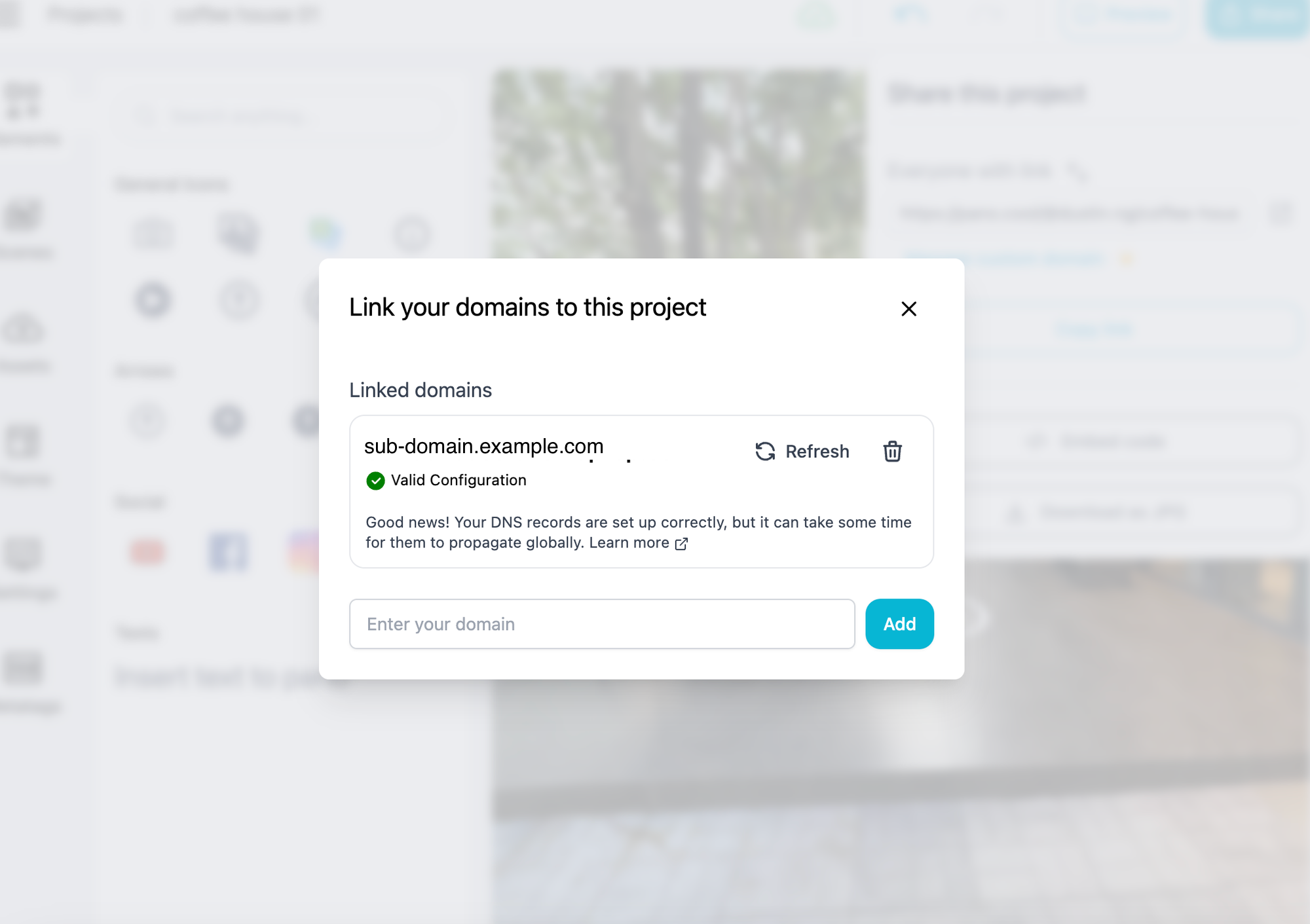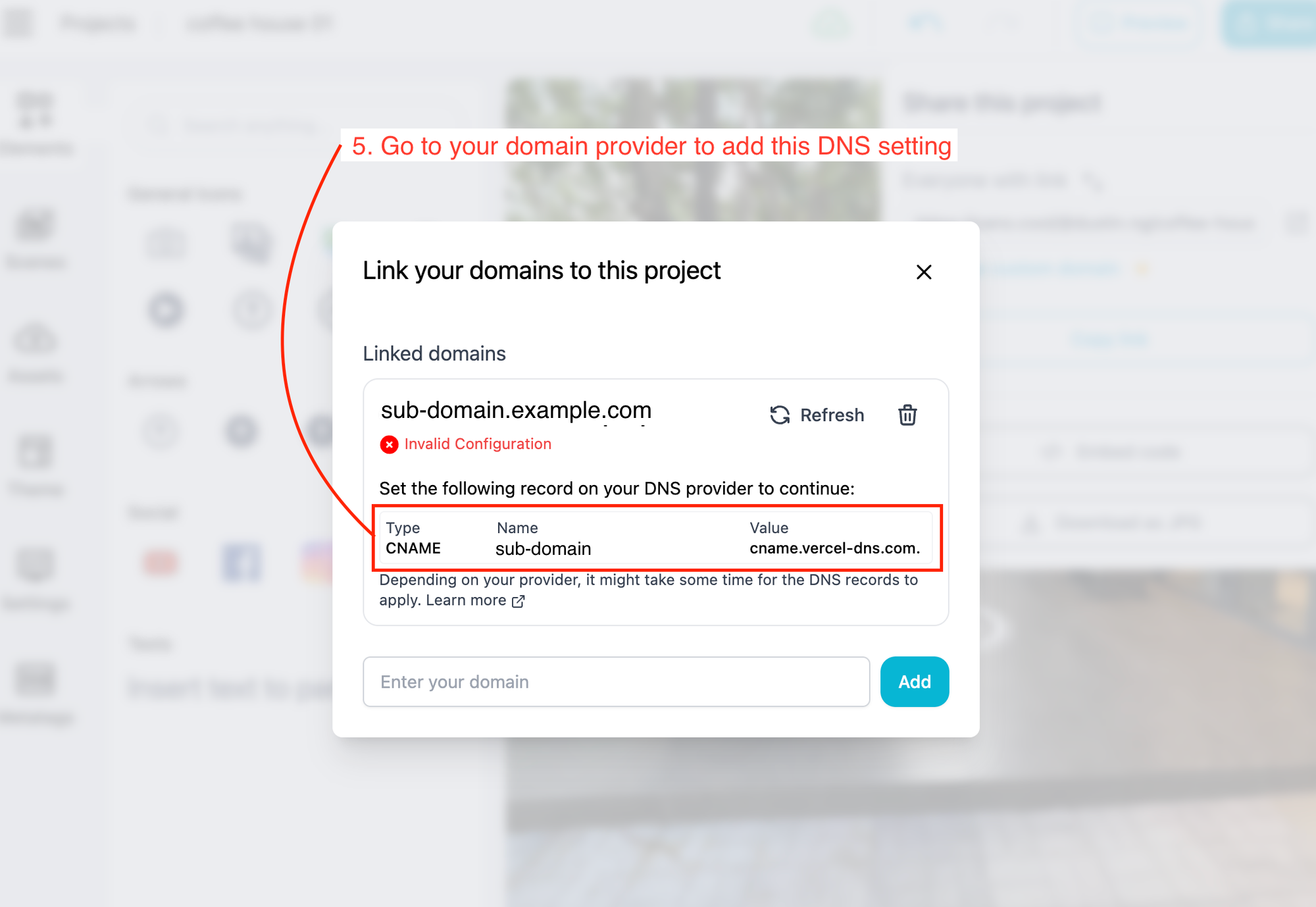 The Custom domain popup will be shown, enter your domain or subdomain and click "Add" button.