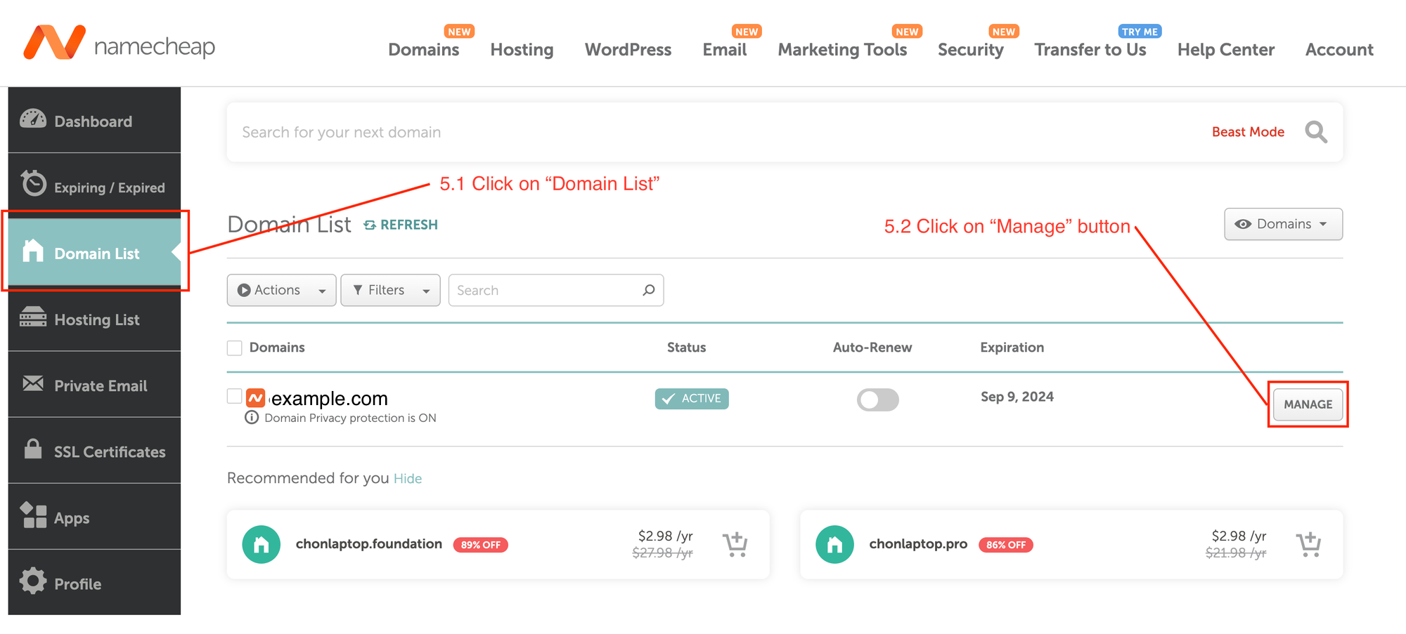 Go to Namecheap dashboard, on the right navbar, select "Domain List", then on the domain we need to config ("example.com" in this case), click "Manage" butotn.