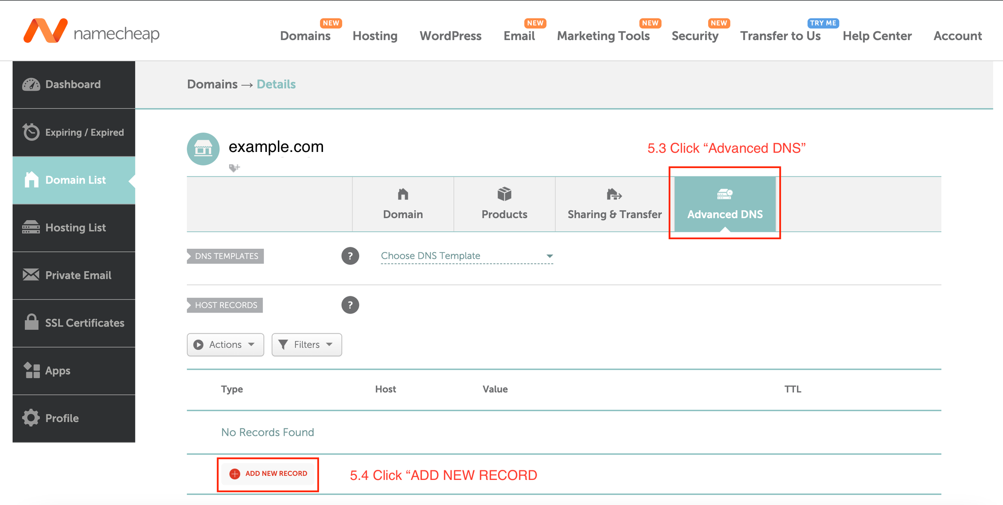 In this example, the domain "example.com" is registered in Namecheap, so we will go to Namecheap to config the DNS.