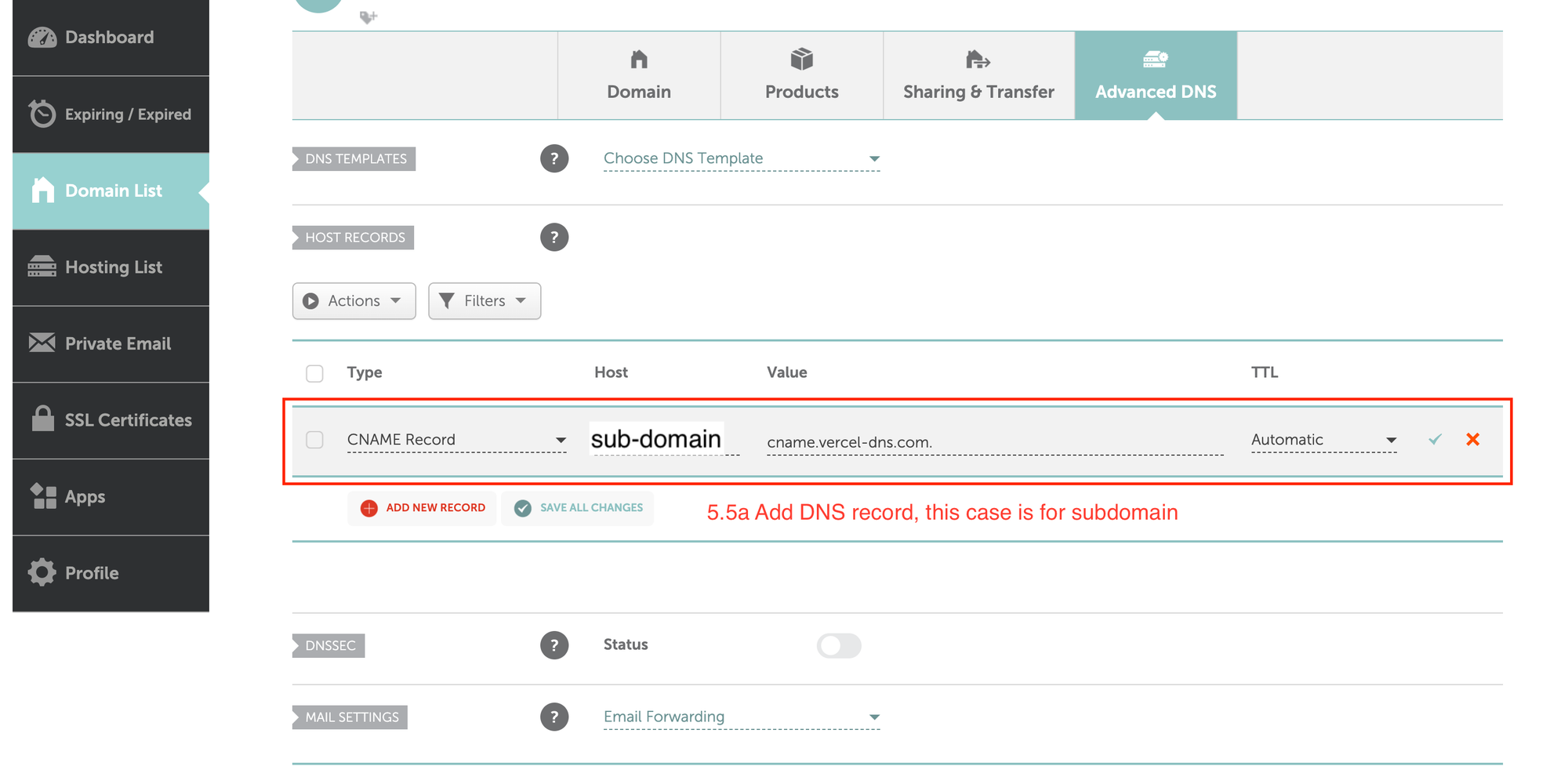 After that, select "Advanced DNS" tab, and click "Add new record"